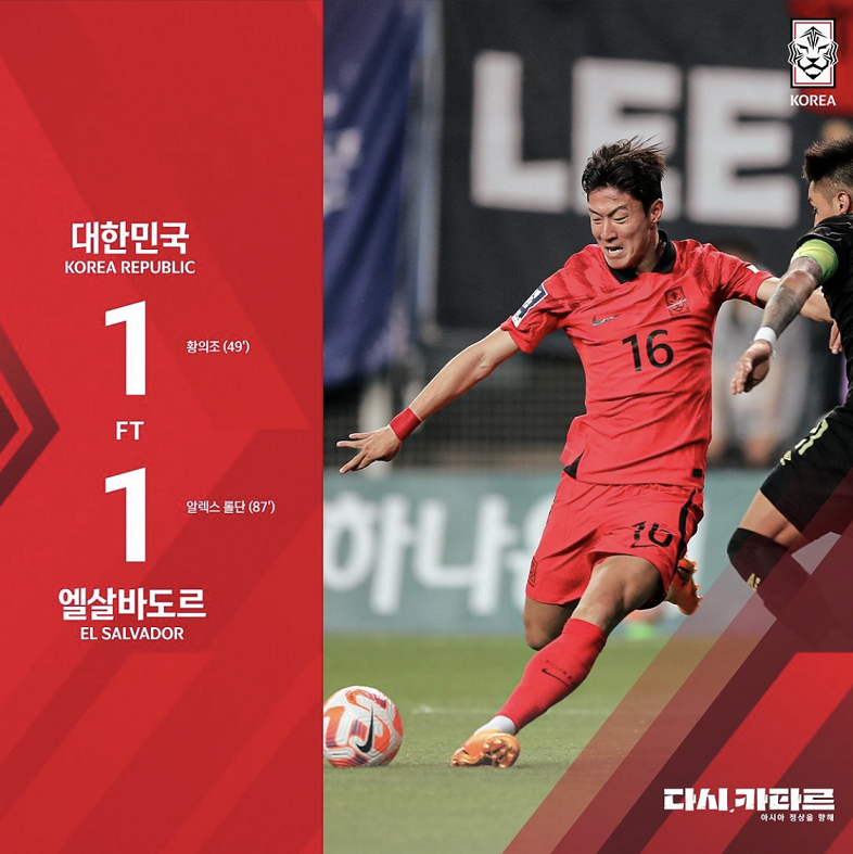 후반전이 시작되며 4분만에 황희찬의 패스를 받아 전반 45분에 교체로 들어온 황의조의 오른발로 골을 완성시켰습니다. 이렇게 경기가 끝날거라고 생각했지만 경기 종료를 앞둔 후반 42분 파울을 얻어낸 엘살바도르의 엔리케스 선수의 크로스를 수비수 롤단의 헤딩 슛으로 동점을 만들었습니다.