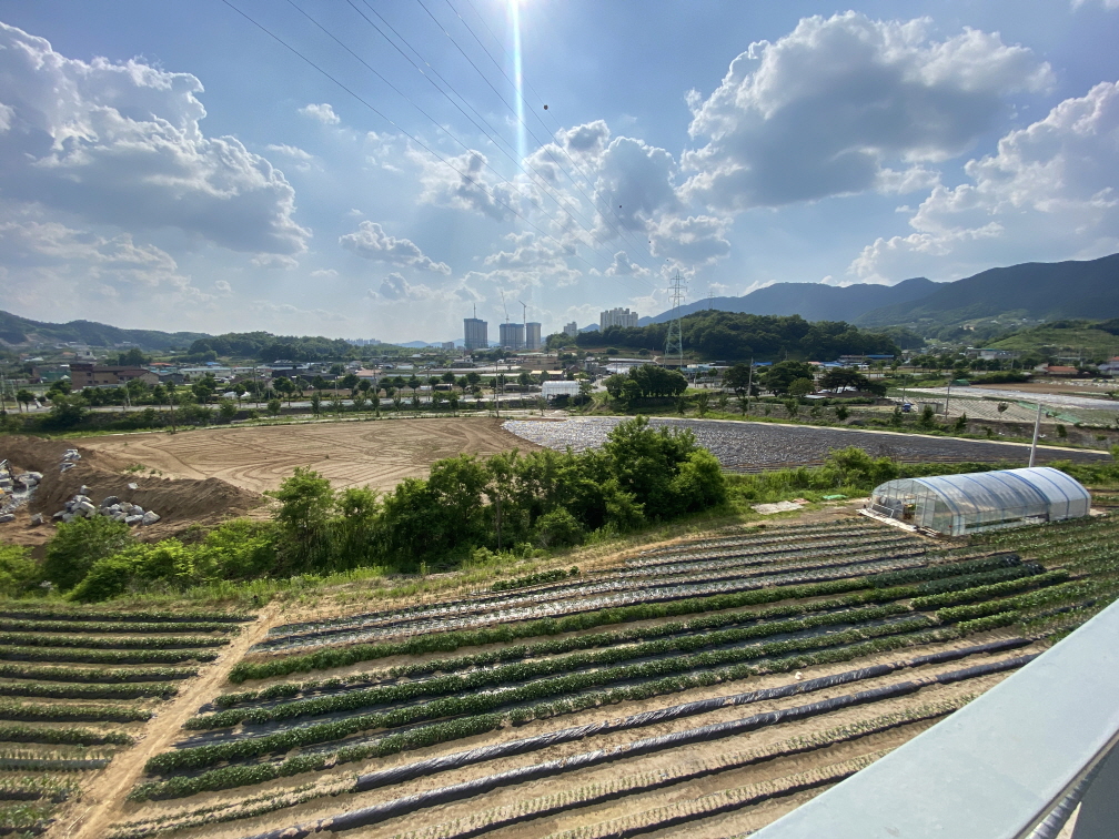 캠핑장 펜스 넘어로는 밭 뷰가 펼쳐졌는데, 사진상에 잘은 안보이지만 새로운 캠핑장을 만드시는건지 왼쪽에 포크레인이 돌을 부수고 있었습니다. 그 덕에 마치 황사인것 처럼 입이 살짝 텁텁해 지긴 했었지만.. 그래도 날씨가 모든걸 커버해줬습니다.