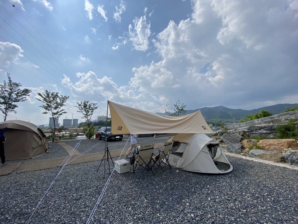 사실 풀세팅이라고 해봐야 아까의 모습에서 원터치텐트 하나 추가했습니다. 사실상 오늘의 가장 큰 목적은 파쇄석 사이트에서 원터치텐트만 가지고 캠핑이 가능할까를 시험해보는것이었습니다. 텐트안에 돗자리 피고, 5T 자충매트로 파쇄석을 느끼지 않고 누워있을 수 있을까? 했는데, 기대이상으로 괜찮았습니다. 6~7월 캠핑은 이 세팅으로 당첨!