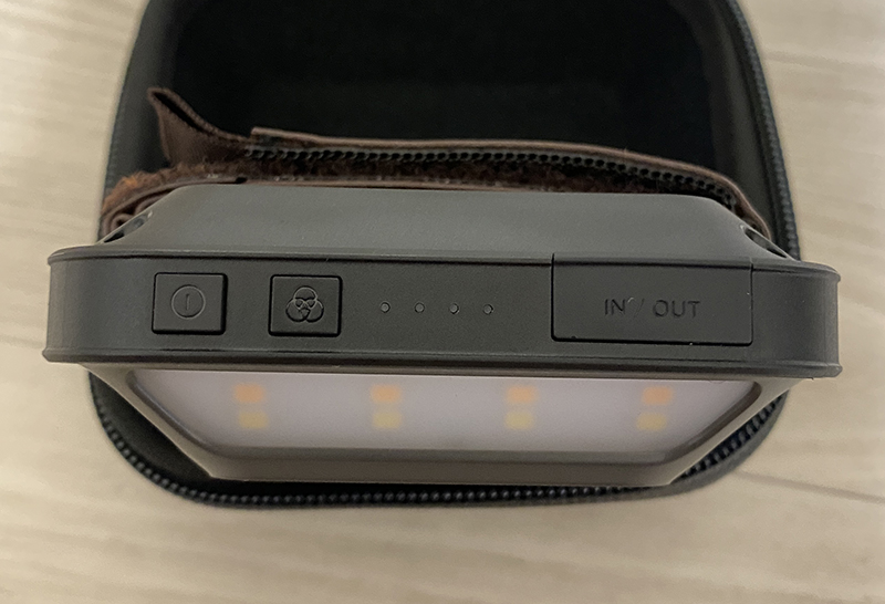 뒷면에는 걸어 사용할 수 있도록 고리가 있으면 뒤에 다시 언급하겠지만 동봉되어 있는 카라비너를 연결하여도 사용이 가능합니다. 옆면에는 전원 버튼과 색상 및 밝기를 조절할 수 있는 버튼, 배터리 잔량 표시등 그리고 충전 IN/OUT C타입 단자가 있습니다. 반대편을 보면 삼각대에 연결할 수 있도록 구멍이 있습니다. 일반적으로 카메라에 사용하는 삼각대에도 설치가능합니다.